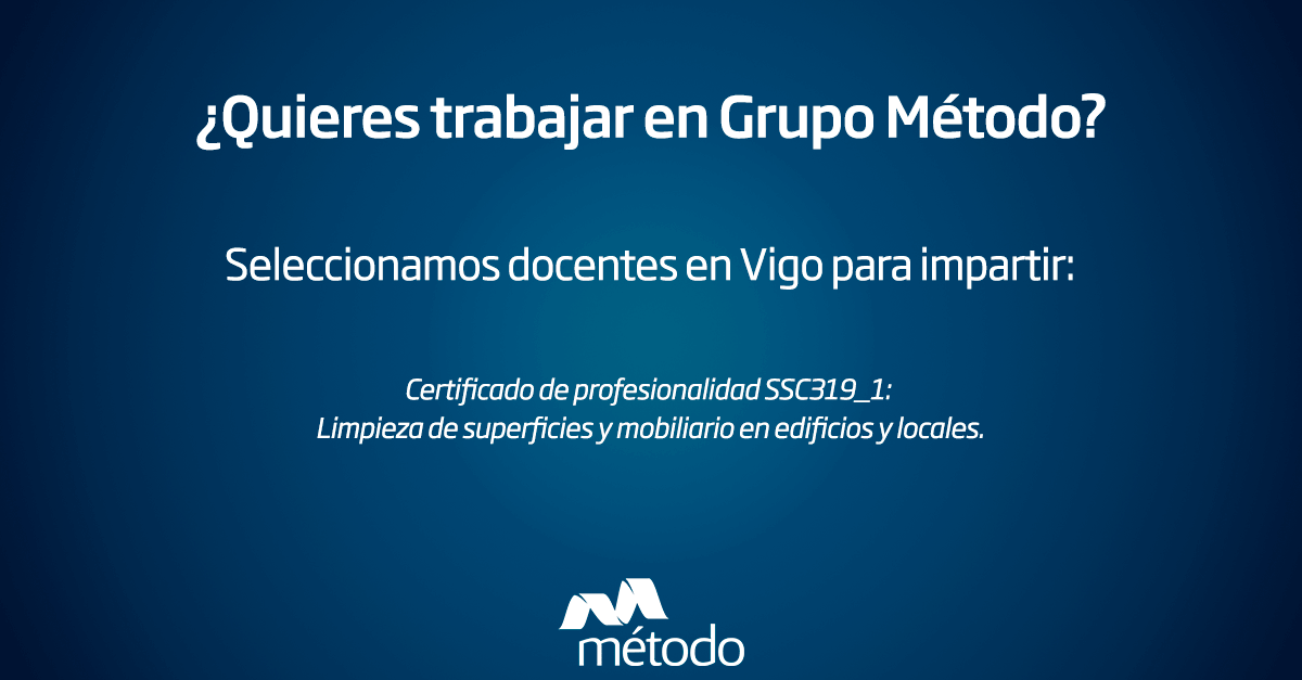 En Grupo Método, Consultora Global de Servicios Educativos y Proyectos Sociales, seleccionamos docentes para la impartición, en Vigo (Pontevedra), del certificado de profesionalidad SSC319_1: Limpieza de superficies y mobiliario en edificios y locales.